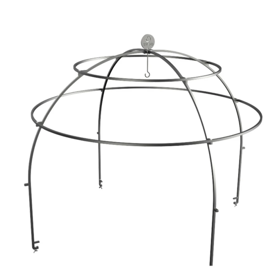 Elle est constituée de 4 arches entrecroisées formant une solide structure en dôme. 2 cercles horizontaux enserrent le tout pour un maximum de stabilité. Les aliments peuvent être suspendus par des crochets en S (non inclus) ou piqués sur des barres à brochettes (non incluses).