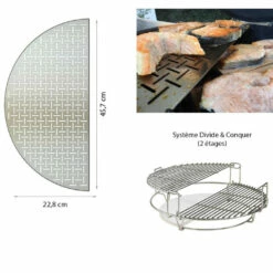 La plaque demi-lune en inox de dimensions 45,7 x 22,8 cm est spécialement adaptée au modèle de barbecue Classic Joe de chez Kamado Joe.
